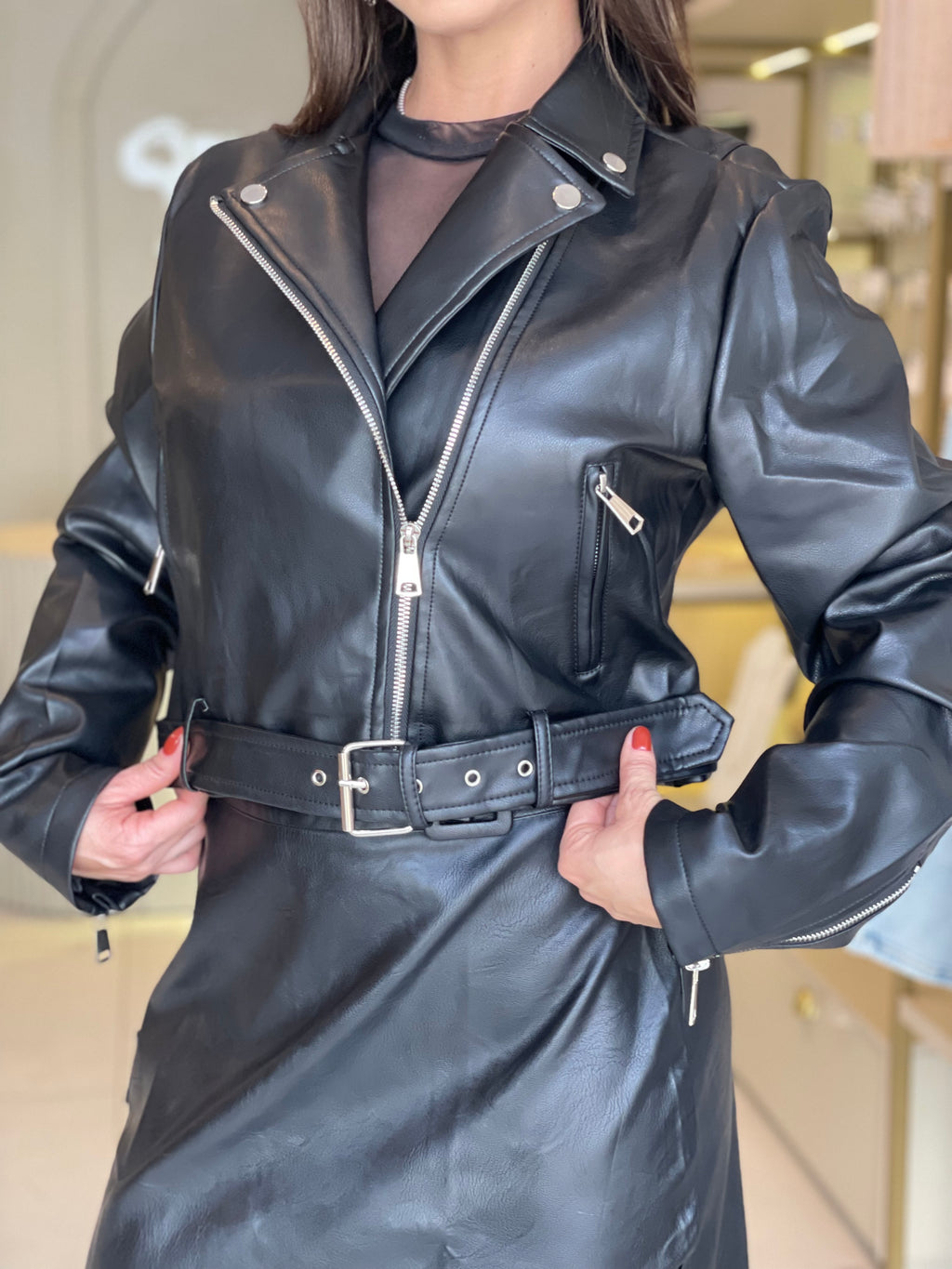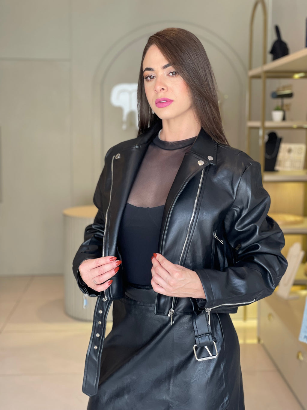 Jaqueta em couro sintético preto, estilo biker, com design moderno e cheio de atitude.